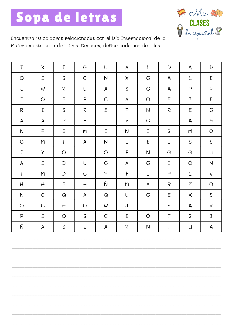 ✅ Lecturas adaptadas para diferentes niveles (A1-C1) sobre la historia del Día de la Mujer.
