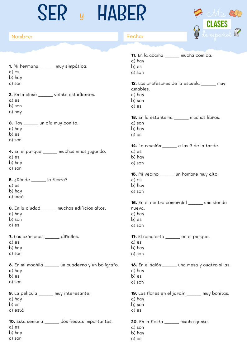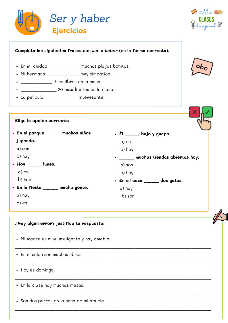 Trabaja con tus estudiantes los verbos «ser» y «haber» (hay) a través de estas actividades cooperativas y visuales. 12 páginas concisas pero eficientes para aclarar estos conceptos.